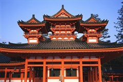 【平安神宫】(约 30分钟)平安神宫建于 1895 年,是为纪念迁都京都 1,100 年作为市民参拜的总社而建的。神宫模仿平安京大内里正厅而建的应天门和大极殿等均为朱漆建筑,美丽夺目。占地约 3 万平方公尺的池泉迂回式庭园「神苑」,当春天樱花盛开时,这里更是赏樱名所。秋季红叶迷人,是京都必游景点之一。